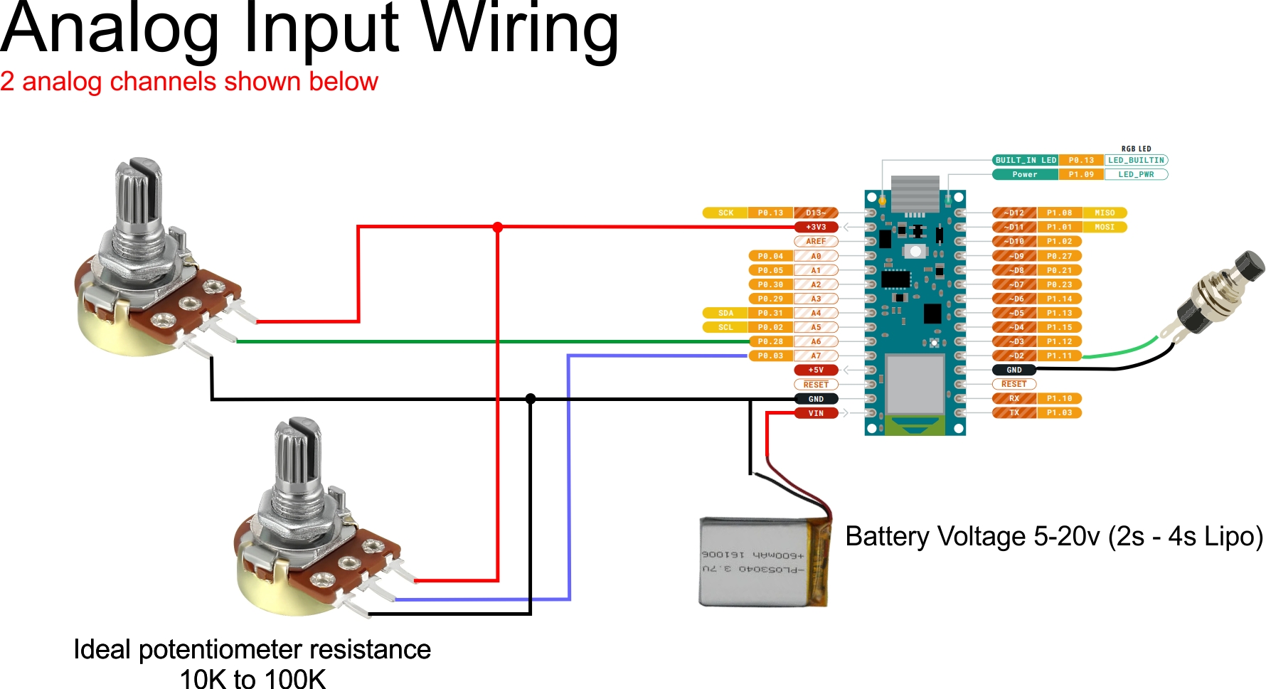 Head Tracker software supports multiple analog inputs with a 0 to 3.3V range. They can be used for anything you wish but the initial intention was for them to be used as a throttle and rudder input. This will allow you to use this software as a single handed controller. Using roll for aileron and tilt for elevator. Rudder can't use the pan output because if you spin your body the rudder will also change which is why it's using an analog input.