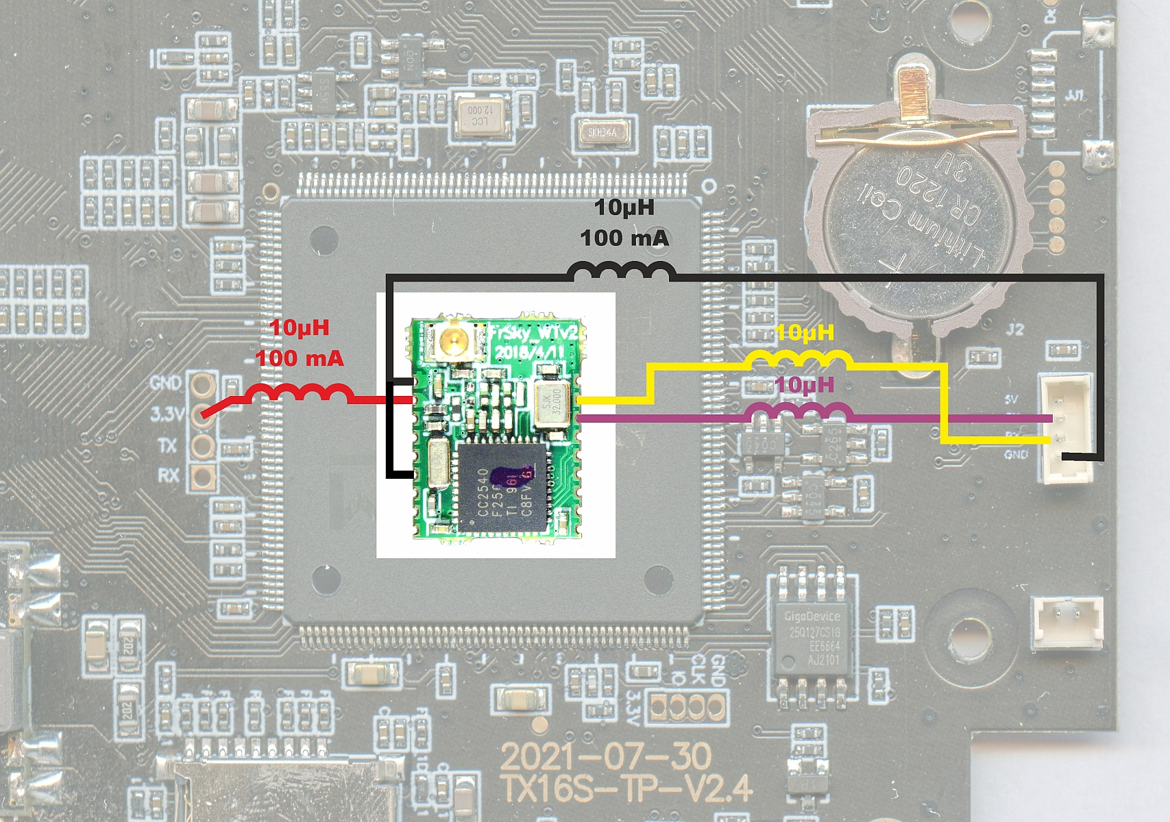 The new TX16S, called the Mark2 no longer has the solder pad available. Instead it was replaced with a 4 pin MX1.25 connector. You can still attach a Bluetooth module but the wiring isn't the same. **The connector now has 5V on it not 3.3V.** You have to get the 3.3V from another source. There is an available 3.3V on the USART3 connector to the left of the CPU. **Note: This 3.3V connection cannot supply a lot of current.** Both the PARA & CC2540 Bluetooth modules are low current and will work fine. **Do not use a ESP module.**