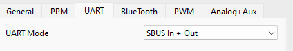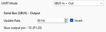 In the GUI the **inverted** option **needs to be selected**. SBUS uses a idle signal level which is low. Radio Master expects a standard UART signal, which is idle high.