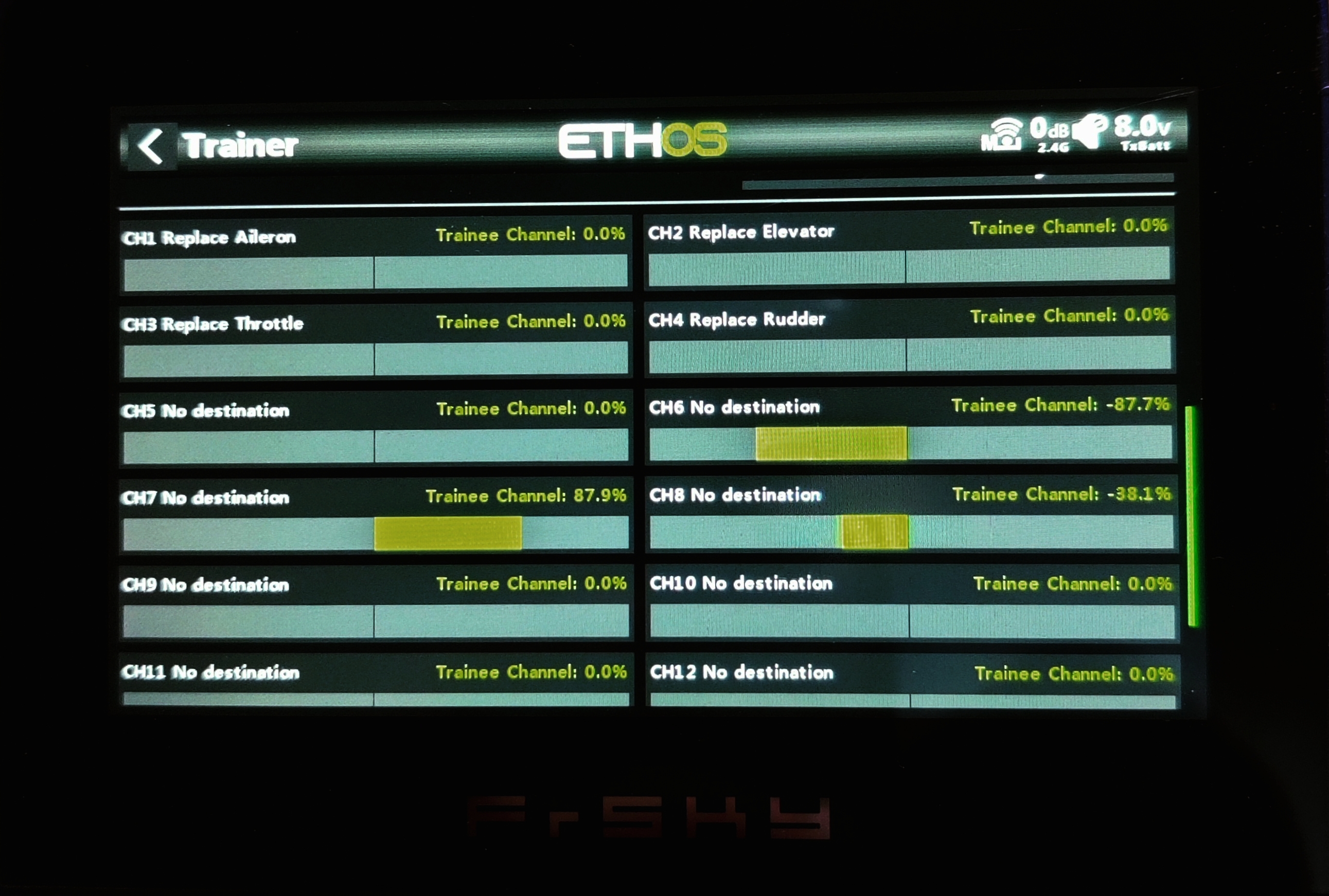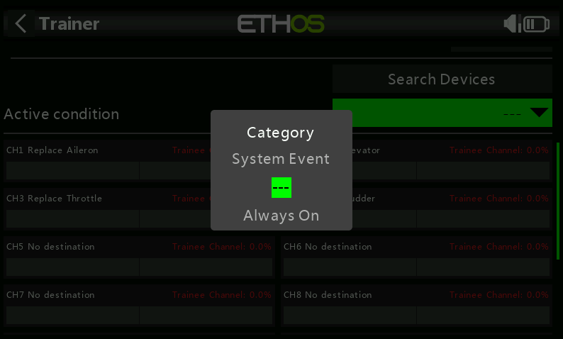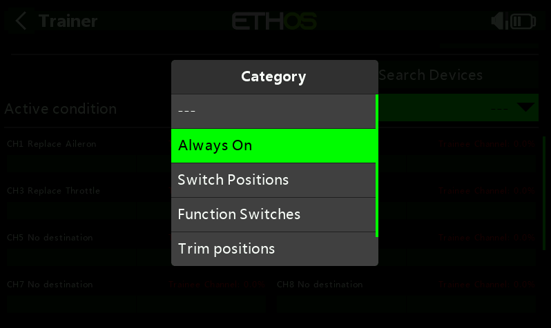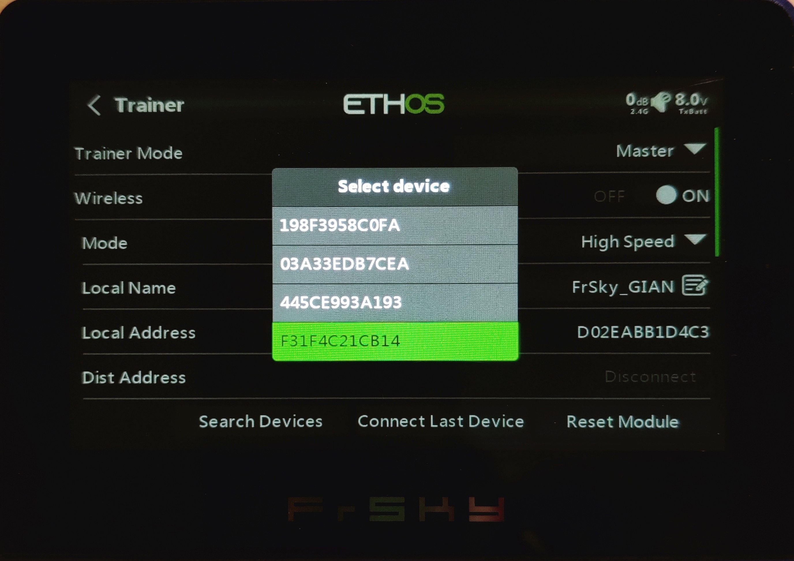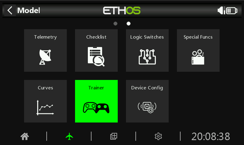 Here we see the Bluetooth address of the Arduino board, mine is "F3:1F:4C:21:CB:14", now that we know it we can go back to the radio and connect the Head Tracker. We need to go in the trainer menu that is in the second model page, as shown in the pictures below.