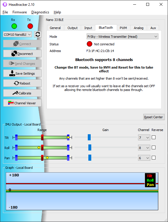 Now we need to enable Bluetooth on the Arduino board and select on wich channels we want to send the outputs, so go to the Bluetooth tab and select: "FrSky - Wireless Transmitter (Head)". Then go down in the : "IMU Output - Local Board" and select a channel for each movement that we want to send to the radio (remember that only the first 8 channels can be sent via Bluetooth).